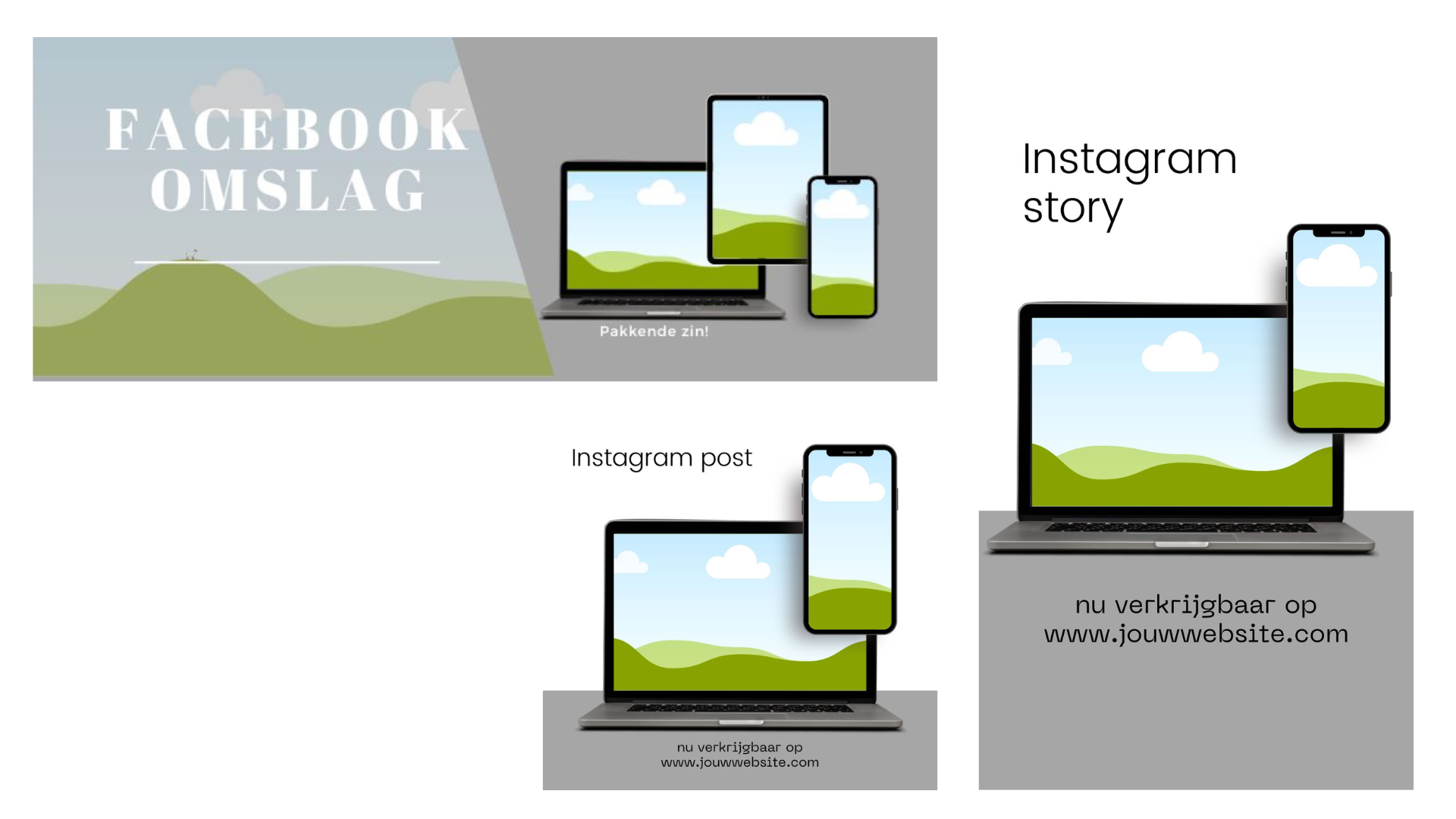 Voer je branding door in je social media posts en gebruik deze sjablonen om je e-book te lanceren en te delen op Facebook, Instagram, LinkedIn of Pinterest. Als je de Canva pro versie hebt kun je snel en simpel nog meer formaten maken.